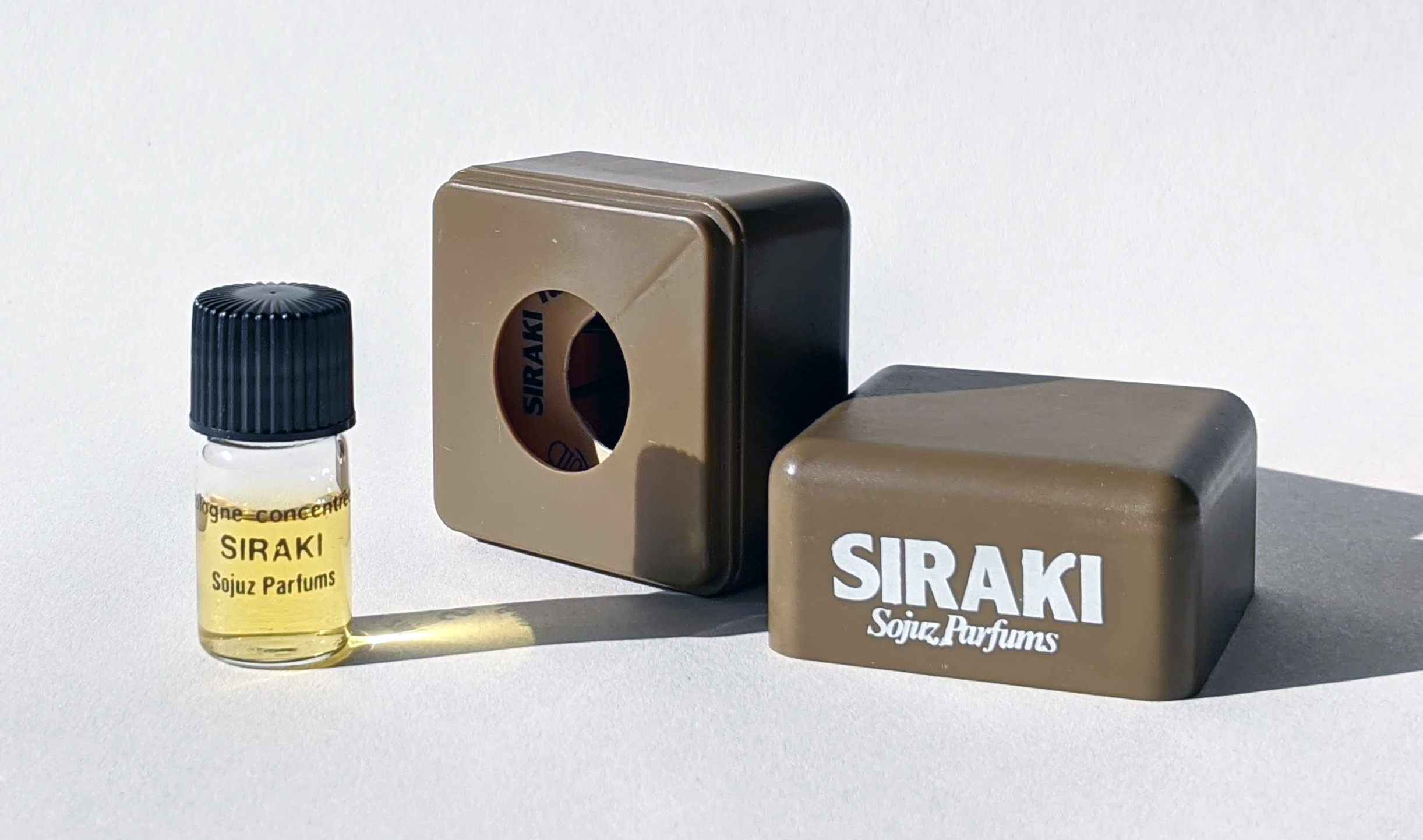 Про Siraki буклет сообщает, что дизайн флакона вдохновлен песочными часами. Кроме стекла в нем использована также ударопрочная пластмасса оливкового цвета. Согласно рекламе, аромат Siraki был выпущен в концентрациях eau de toilette, eau de cologne, parfum de toilette – но на пробнике написано "eau de toilette concentree". Покупателям предлагали три варианта объема: 66, 100 и 150 мл.